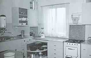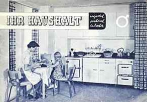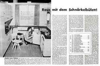 "Raus mit dem Schnörkelbüfett!"Ändert eure Küchen und ihr ändert euer Leben" - dieses amerikanische Schlagwort ist jetzt auch ein deutsches geworden. Es steht auf Punkt 1 auf dem Umerziehungsprogramm, mit dem moderne westzonale Wohnspezialisten die deutsche Hausfrau von einigen lieben alten Küchengewohnheiten abbringen wollen." Zeitschriftenbericht