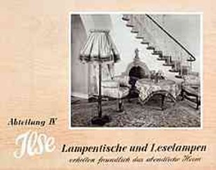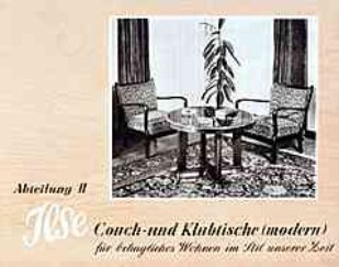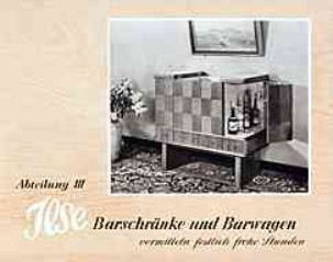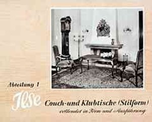 | | Ilse Einzelmöbel Katalog 1952/53 - Deckblatt "Abteilung I Couch- und Clubtische (Stilform) |  | |  | | Ilse Einzelmöbel Katalog 1952/53 - Deckblatt "Abteilung II Couch- und Clubtische (modern) | | |  | |  | | Ilse Einzelmöbel Katalog 1952/53 - Deckblatt "Abteilung III Barschränke und Barwagen" | | Ilse Einzelmöbel Katalog 1952/53 - Deckblatt "Abteilung IV Lampentische und Leselampen" |