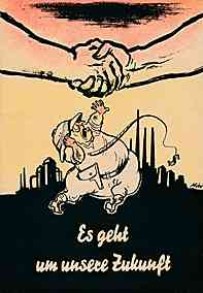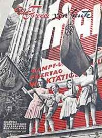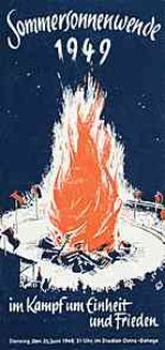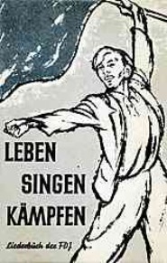 | |  | |  | "Sommersonnenwende 1949 - im Kampf um Einheit und Frieden" - "Programm zur Sommersonnenwende" | | "Es geht um unsere Zukunft", anti-westliche Propagandaschrift, "Herausgegeben vom Zentralrat der Freien Deutschen Jugend, Abteilung Schulung" | | "Leben singen kämpfen" - "Liederbuch der FDJ" - Aus dem Inhalt: "Bekämpft den Krieg", "Brüder zur Sonne", "Deutschland in Not", "Die ihr arbeitet", "Herrlicher Baikal", "Man hat uns Freude und Frohsinn geraubt", "Pflüge, Traktor, pflüge" |