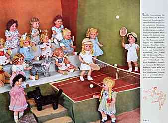 | | "Welche Entwicklung die hauptsächlich im Waltershäuser und Sonneberger Gebiet beheimatete Puppe von der primitiven Holzdocke bis zur heutigen modernen Ausführung genommen hat, zeigen die folgenden Abbildungen. Die Industrie kann alle Käuferwünsche erfüllen."