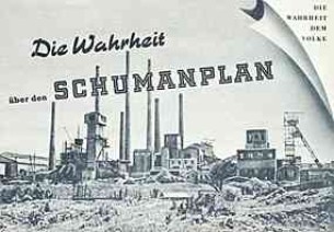 "Die Wahrheit über den Schumanplan" "Nicht der SCHUMANPLAN, der Aufrüstungsplan für die amerikanischen Kriegstreiber, sondern unser FÜNF JAHR PLAN zeigt den Weg zu Frieden und Wohlstand für alle Menschen." Propagandaheft, herausgegebe vom "Amt für Information der Regierung der Deutschen Demokratischen Republik"