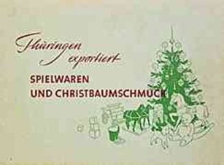 |  | |  | Industrie- und Handelskammer Thüringen - "Thüringen exportiert SPIELWAREN UND CHRISTBAUMSCHMUCK", Katalog mit 24 farbigen Bildtafeln und Herstellerverzeichnis | | "Was die Leistungsfähigkeit und Initiative der Hersteller aus den einstmals starren Holzspielzeugen gemacht hat, zeigt die nebenstehende Abbildung."
