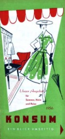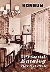 | |  | Versandhaus Leipzig - "Katalog Sommer Herbst 1956" | | KONSUM "Versand Katalog Herbst 1956" | | "HO - gut bedient - gut gekauft", Streichholzschachteletikett (schätzungsweise 1956)