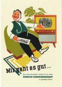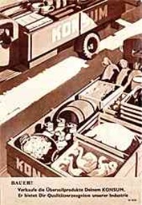 | | "Bauer! Verkaufe die Übersollprodukte Deinem Konsum. Er bietet Dir Qualitätserzeugnisse unserer Industrie." |