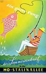 | | |  | |  | HO-Kaufhaus Leipziger Strasse Berlin "erfüllt Ihre Einkaufswünsche in seinen 14 Spezialabteilungen" | | "Ein guter Fang... der Sommereinkauf in der HO-Stalinallee"