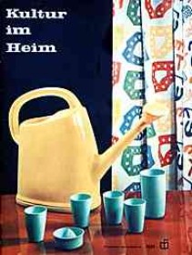 | | | "Blumengießer", um 1961, Polystyrol, Länge 30 bzw. 36 cm, VEB Glasbijouterie Zittau, Gestalter Klaus Kunis | | Kultur im Heim - Titel: "Plastwerkstoffe, diese "Allerweltsmaterialien" der Neuzeit, stellen wir in diesem Heft vor." - Weitere Themen z.B.: "Zukünftige Wohnform in Stalinstadt bereits Wirklichkeit", "Die Form des Unscheinbaren" | | |