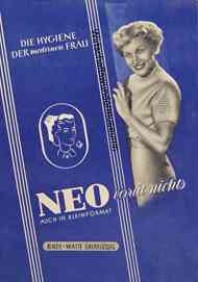 | |  | |  | ABC der Kosmetik, Ratgeber-Buch | | NEO - "Die Hygiene der modernen Frau" - "Binde Watte überflüssig", Werbepappe, ca. 28 x 40 cm (schätzungsweise um 1961) | | "Von Jahr zu Jahr - Das Jahrbuch für die Frau 1961" - Themen z.B.: "Lustige Camping-Schürzen", "Steppdecken - selbst genäht", "Feiertage - auch für die Hausfrau", "Abendessen 18 Uhr", "Eine Tasse guter Kaffee" |