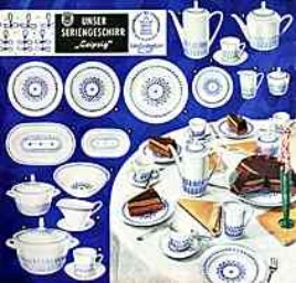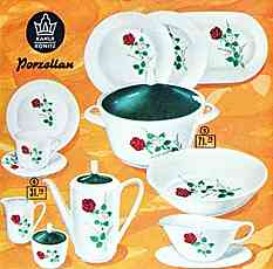 | Versandhaus Leipzig - "Plasterzeugnisse - ein Ausdruck unserer Zeit" | | | | Kahla Könitz - Tafelservice/Kaffeeservice - "Weißes Porzellan mit Rosendekor in naturgetreuer Farbwiedergabe, zeitlos in Form und Dekor." |