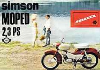 | |  | | | | | VEB Fahrzeug- und Gerätewerk Simson Suhl - "Simson Moped 2,3 PS Spatz" - "Wirtschaftlich, robust, wartungsfrei: Zuverlässigkeit in höchster Potenz", Prospekt