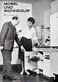 | | MÖBEL UND WOHNRAUM - "Titelbild: Der VEB Holzverarbeitungswerk Burg bei Magdeburg stellte zur Leipziger Herbstmesse 1966 dieses weiterentwickelte Anbauküchenmodell aus, in das auch die Waschmaschine mit einbezogen wurde." | | "Das Gewissen vieler Ehemänner regt sich beim Gedanken an den größten Arbeitsplatz der Welt: die Küche. Denn zum Mann von heute gehören Hilfsbereitschaft und Verständnis für die Probleme seiner Frau. Die klug durchdachte Küchenmaschine KM 6 und die automatische Geschirrspülmaschine GSM 1 helfen, diese Probleme zu lösen." |