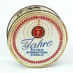| | | | Blechdose / Keksdose "25 Jahre Deutsche Demokratische Republik", Ehemaliger Inhalt: "EXQUISIT-Gebäck-Waffel-Mischung mit Schoko-Tunkmasse", Hersteller: "VEB Nahrungsmittelkombinat "Albert Kuntz" Wurzen", Durchmesser: 22cm |