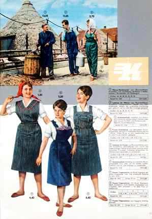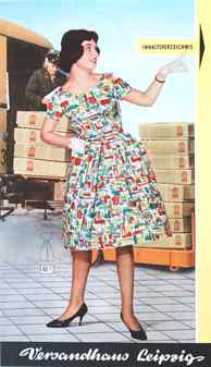 „Mit voller Kraft voraus“ soll auch die Versorgung der Versandhandelskunden „ständig verbessert werden. Eine große Strecke haben wir gemeinsam erfolgreich zurückgelegt, doch bleibt noch viel zu tun. Aber wir werden es schaffen, schon weil wir alle in einem Boot sitzen, das den Kurs Frieden und Sozialismus hält.“ „Werktätige in Stadt und Land – alle schaffen für den Sozialismus“ heißt es danach im Innenteil auf den Seiten mit der Arbeitskleidung und die abgebildete „Schöne Wäsche“ ist ein „Zeichen unseres wachsenden Wohlstands“. Im nachfolgenden Katalog wird die Kleidung alsdann von „Gut gekleideten Frauen auf der LPG-Konferenz“, „Frauendelegationen auf der Leipziger Messe“ oder festlich gekleideten Damen beim „Theaterabend im Dorf-Kulturhaus“ präsentiert, bzw. wird versucht, durch entsprechenden Überschriften diese Illusion zu erzeugen. Bildlich wird das Ganze – vermutlich aus Kostengründen - jedoch leider nur andeutungsweise durch einige schemenhafte Hintergrundillustrationen in Szene gesetzt. In späteren Katalogen werden vermehrt Zitate des Staatsratsvorsitzenden Ulbricht wiedergegeben und in dem zum 20-jährigen DDR- Gründungsjubiläum erschienenen Exemplar von 1969 darf sich erstmals Erich Honecker zu Wort melden, wodurch die zwei Jahre später erfolgende politische Wachablösung zwischen den beiden Politikern regelrecht vorweggenommen wird: „Zwanzig Jahre Deutsche Demokratische Republik – das sind 20 Jahre systematische Verbesserung der materiell-kulturellen Lebensbedingungen der von der Ausbeutung befreiten Werktätigen.“