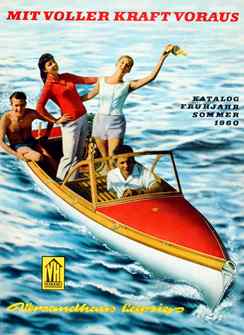 In den ersten Versandhauskatalogen jedenfalls ist nur hin und wieder ist ein dezenter Hinweis auf die Vorzüge des Sozialismus und „die hohen Leistungen volkseigener Betriebe“ zu entdecken, was sich jedoch im Laufe der Jahre ändert: „Mit voller Kraft voraus“ lautet beispielsweise das Motto des Frühjahr/Sommer Katalogs 1960, auf dessen Titel vier fröhliche junge Menschen diese Vorgabe mit ihrem „idealen Mehrzweckfaltboot Delphin 110“ in die Tat umsetzten.im Dorf-Kulturhaus“ präsentiert, bzw. wird versucht, durch entsprechenden Überschriften diese Illusion zu erzeugen. Bildlich wird das Ganze – vermutlich aus Kostengründen - jedoch leider nur andeutungsweise durch einige schemenhafte Hintergrundillustrationen in Szene gesetzt. In späteren Katalogen werden vermehrt Zitate des Staatsratsvorsitzenden Ulbricht wiedergegeben und in dem zum 20-jährigen DDR- Gründungsjubiläum erschienenen Exemplar von 1969 darf sich erstmals Erich Honecker zu Wort melden, wodurch die zwei Jahre später erfolgende politische Wachablösung zwischen den beiden Politikern regelrecht vorweggenommen wird: „Zwanzig Jahre Deutsche Demokratische Republik – das sind 20 Jahre systematische Verbesserung der materiell-kulturellen Lebensbedingungen der von der Ausbeutung befreiten Werktätigen.“