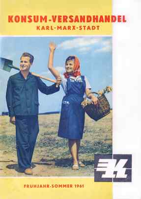 Dessen Realisierung wird abermals, diesmal jedoch endgültig, in die Verantwortung der Konsum – Genossenschaften übertragen. Diese versuchen natürlich tunlichst, die Fehler der Leipziger zu vermeiden und finden mit den Kauffahrtei-Anlagen in Karl-Marx-Stadt einen in mehrerlei Hinsicht viel versprechenden Standort. Zum einen sind etliche der für den Konsum produzierenden Betriebe bereits in dieser Gegend ansässig, sodass lange Anlieferungswege entfallen, zum anderen besitzt das Gelände eine sehr gute Verkehrsanbindung und verfügt über ausreichende und zudem noch ausbaufähige Lagerkapazitäten. Auch bezüglich des „Know-how“ verlässt man sich nicht ausschließlich auf die im eigenen Land gesammelten Erfahrungen, sondern schickt unter anderem sogar eine Delegation in die Bundesrepublik, um von den dort gemachten Erkenntnissen zu profitieren. Darüber hinaus werden hunderte der vorhandenen Konsum-Verkaufsstellen geschlossen, um einen höheren Anteil der verfügbaren Warenproduktion in den Versandhandel abzweigen zu können. Sichtbares Ergebnis der Bemühungen des „Konsum-Versandhandel Karl-Marx-Stadt“ ist ein im Frühjahr 1961 erscheinender 84-seitiger Katalog im annähernden Din-A4 Format mit über 1000 Artikelpositionen, der nun endlich auch das eigentlich von Beginn an geplante große Sortiment landwirtschaftlichen Bedarfs offeriert. Bereits das Titelbild zeigt „zwei junge Menschen, die optimistisch und lebensbejahend zur Feldarbeit gehen“.