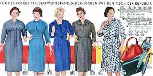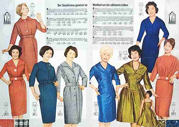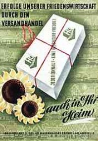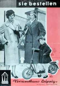 "Erfolge unserer Friedenswirtschaft durch den Versandhandel auch in Ihr Heim. - Werter Kunde! Hiermit überreichen wir Ihnen den ersten Katalog des neu eingerichteten Versandhandels der HO-Warenhäuser. Der staatliche Handel kommt also diesmal ins Haus, um Ihnen Ihre Einkäufe zu erleichtern. Wir sind überzeugt, daß diese Einrichtung, besonders wenn Sie in ländlichen Gebieten wohnen, Ihren Wünschen entspricht." - Versandhandel des HO Warenhauses Erfurt (1959)  | |  | "Aus der Fülle unserer Angebote auf folgenden Katalogseiten", Versandhaus Leipzig - "Herbst-Winter Katalog 1958/1959" | | Versandhaus Leipzig - "FDGB Ferienheim - Glück auf!" (1958) |