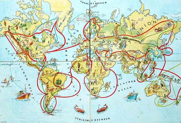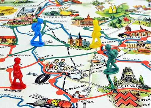 Stand den DDR-Bürgern die weite Welt bis Mitte/Ende der 50er Jahre zumindest per Gesellschaftspiel noch uneingeschränkt offen, wurde selbst diese spielerische Reisefreiheit gegen Ende des Jahrzehnts eingegrenzt.- "Weltreisespiele" verschwanden zusehends aus dem Spielwarenangebot, man blieb fortan ausschließlich im eigenen Lande...