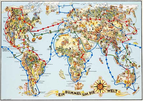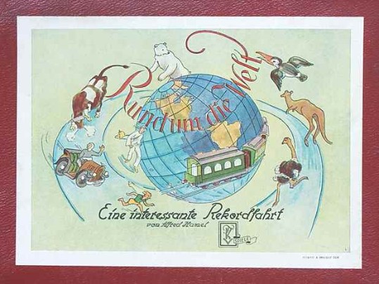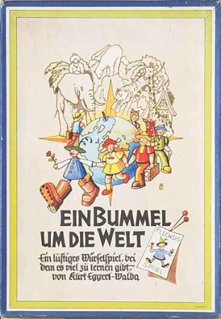 | "Ein Bummel um die Welt" - "Ein lustiges Würfelspiel, bei dem es viel zu lernen gibt, von Kurt Eggert-Walda", Firma Walter Flechsig, 1950 |