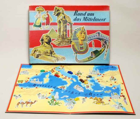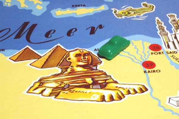 | "Das Spiel führt uns in einer Autoreise rund um das Mittelmeer durch 3 Erdteile" - Mit dem Trabi zu den Pyramiden? Oder war das Spiel "Rund um das Mittelmeer" nur für den Export gedacht? Oder nur für Privilegierte? Wie auch immer...seltenes Zeitzeugnis aus dem Jahr 1959 vom VEB Kartonagen und Bürobedarf Karl-Marx-Stadt. |