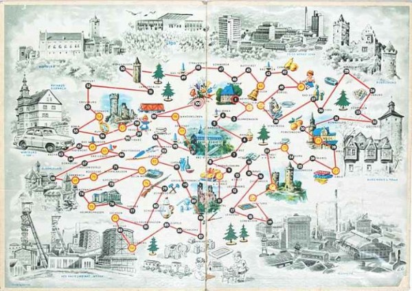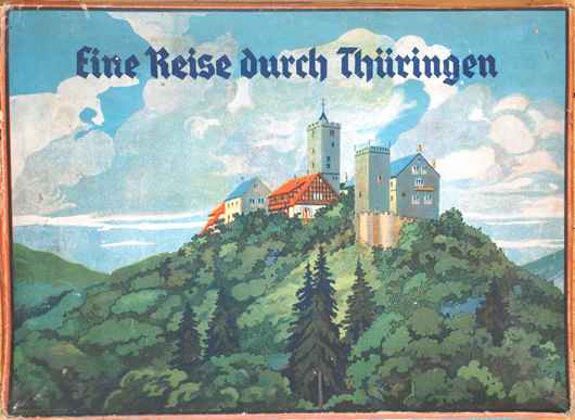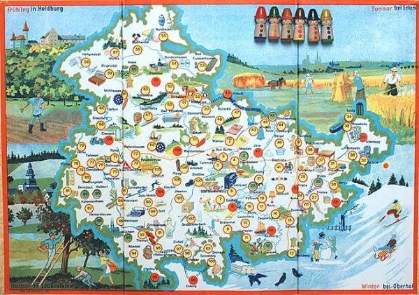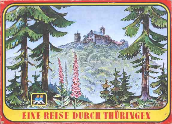 | "Eine Reise durch Thüringen", VEB (K) Kartonagen u. Bürobedarf, Karl-Marx-Stadt S 8, 60er Jahre, "Dieses Spiel soll zur Vertiefung der Heimatliebe dienen und die Freude zum Reisen und Wandern anregen." |