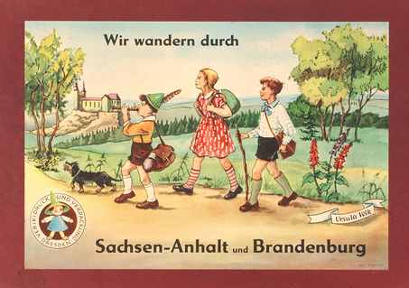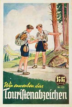 "Wir erwerben das Touristenabzeichen" "Wie könnten wir unsere deutsche Heimat besser kennenlernen, als durch fleißiges Wandern? Aber das Wandern will gelernt sein! Manch einer geht durch die schönste Landschaft, ohne sie eigentlich recht zu sehen, ohne vor allem die kleinen Schönheiten am Rande des Weges zu beachten." Si-Si Spiele Nr. 135, 1955