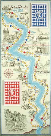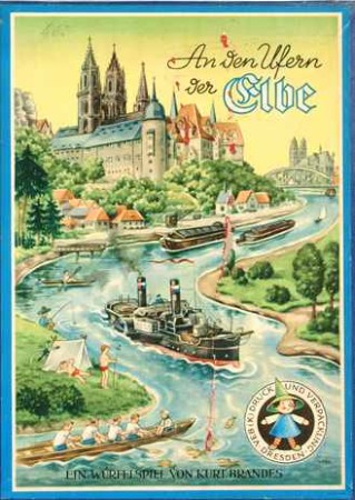 | |  | "An den Ufern der Elbe", VEB (K) Druck und Verpackung Dresden, Örtliche Industrie der Stadt Dresden, Abt. Verlagserzeugnisse, Schachtel 29 x 23 x 2cm | | Spielbrett 25,5 x 68cm |