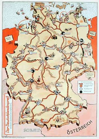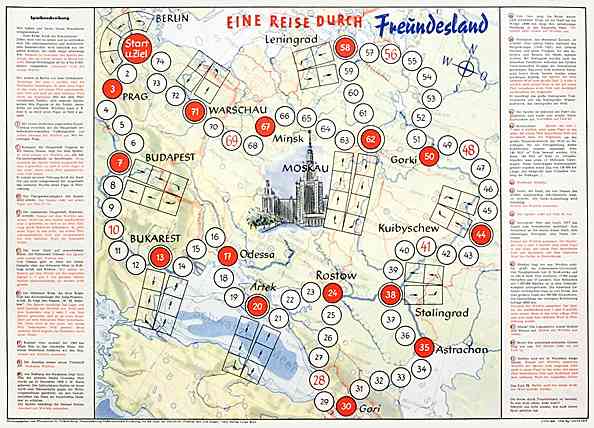 | "Gute Fahrt durch unser deutsches Vaterland", wobei letzteres bei diesem 1953 erschienenen DDR-Verkehrsspiel noch ein Gesamtdeutsches ist. Sonderfeld 49: "Hof. Hat zuviel Kulmbacher Bier getrunken und darf nicht weiterfahren (Alkoholververbot für Kraftfahrer)." 54: "Dresden, berühmte Stadt an der Elbe (Zwinger). Nimmt einen Tag freiwillig am Wiederaufbau der Stadt teil. Zweimal aussetzten." |