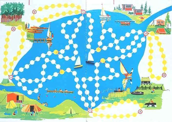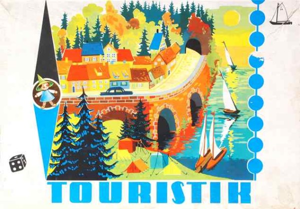 | Ausgesprochen beliebt war Camping. So gibt es bei "Touristik", einem "Touristikspiel", den Aufgabenpunkt "Zelt aufbauen", Spielfiguren sind kleine Plaste-Segelboote. 1965, VEB Spielewerk Karl-Marx-Stadt, Schachtel 36 x 25 x 2,5cm, Spielbrett 48 x 34cm |