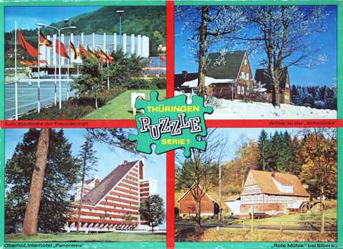 | "Thüringen Puzzle", 4 Puzzles mit den Motiven: Suhl, Stadthalle der Freundschaft - Winter an der Schmücke - Oberhof, Interhotel Panorama - Rote Mühle bei Biberau, Piko Spielwaren, Schachtel 34 x 25 x 3 cm |
