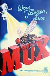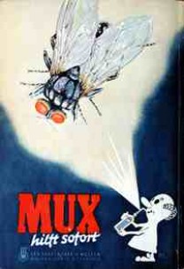 Obwohl nur vier Monate pro Jahr präsent, war auch das für ein gleichnamiges Insektenvernichtungsmittel werbende „Mux-Männchen“ eine ebenso bekannte wie beliebte Werbefigur. „Es kommt und verschwindet mit den Fliegen“ bemerkt Neue Werbung. Aus gleicher Quelle ist auch zu erfahren, dass die Figur von Anfang an nicht nur zum Einsatz als dreidimensionale Plastik, sondern auch für „die flächige Anwendung auf dem Plakat und im Inserat“ konzipiert war: „Die vielfältige Verwendbarkeit bei Mux ist also kein Zufall“. Es entstand so eine ganze Reihe von Anzeigenmotiven, in denen Mux zumindest größenmäßig jedoch nur eine Randfigur abgibt.