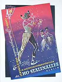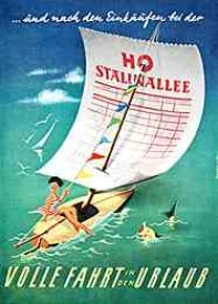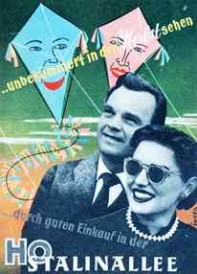 | |  | |  | "Faschingsfreuden durch Einkauf in den Spezialverkaufsstellen der HO-Stalinallee" | | "...und nach dem Einkaufen bei der HO Stalinallee volle Fahrt in den Urlaub" | | "..unbekümmert in den Herbst sehen durch guten Einkauf in der HO Stalinallee"