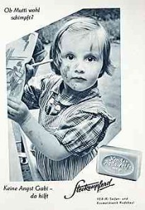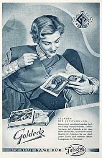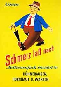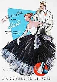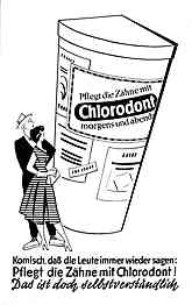 | "Goldeck - der neue Name für Felsche" (Anm.: 1953 wurde die Firma W. Felsche zum VEB Goldeck verstaatlicht.) | | "Schmerz laß nach", Werbeschild (schätzungsweise um 1955) | | "Pflegt die Zähne mit Chlorodont morgens und abends" |