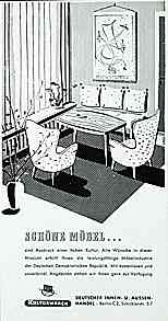 | |  | | | "Besser leben schöner wohnen" - "Möbel-Wanderausstellung des Ministeriums für Leichtindustrie und der deutschen Bauakademie", Heft - Mehr zum Thema "DDR-Möbel 50er Jahre" HIER | | Deutscher Innen- und Aussenhandel - "Schöne Möbel sind Ausdruck einer hohen Kultur", Zeitschriftenwerbung | |