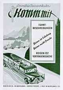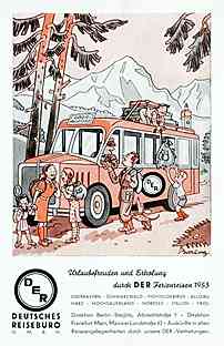 | |  | Deutsches Reisebüro GmbH (DER) - "Urlaubsfreuden und Erholung durch DER Ferienreisen 1953", Zeitschriftenwerbung | | Omnibus-Reiseverkehr "Komm mit" - Fahrtbeschreibungen - "Reisen ist Erholung - Reisen macht Freude - Reisen ist Vertrauenssache" | | "Omnibusfahrten 1953 Kreuz und quer durch Europa" |