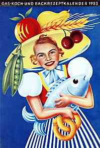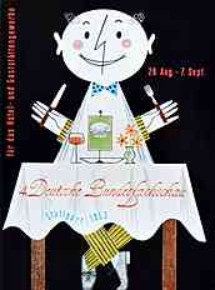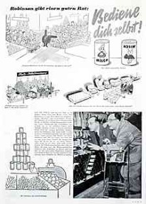 | "4. Deutsche Bundesfachschau des Hotel- und Gaststättengewerbes Stuttgart 1953, 21.Aug.-7.Sept.", Plakatmotiv | | | | Selbstbedienung beim Einkaufen ist im Jahr 1953 für die Bundesbürger noch etwas gänzlich Neues. - "Bediene dich selbst!" - Witzseite in einer Zeitschrift |