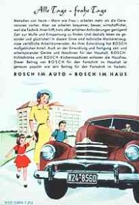 "Alle Tage - frohe Tage Menschen von heute - Mann wie Frau - arbeiten mehr als die Generationen vorher. Aber sie arbeiten bequemer, besser, wirtschaftlicher, weil die Technik ihnen hilft, trotz aller erhöhten Anforderungen genügend Zeit zur Muße und Entspannung zu finden. Und deshalb leben sie gesünder und glücklicher! In diesem Sinne sind technische Markenerzeugnisse verläßliche Arbeitskameraden. An ihrer Entwicklung hat BOSCH maßgeblichen Anteil. Auch an der Entwicklung und Fertigung zeit- und arbeitssparender Geräte und Maschinen für den Haushalt. BOSCH-Kühlschränke und BOSCH-Küchenmaschinen entlasten die Hausfrau. (...) Bosch im Auto - Bosch im Haus" - Mehr zum Familienbild der 50er Jahre HIER