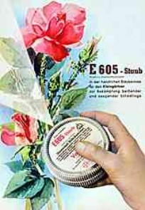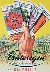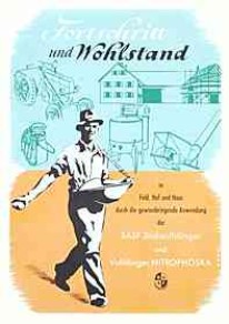 | "E605-Staub in der handlichen Stäubedose für den Kleingärtner zur Bekämpfung beißender und saugender Schädlinge" | | "Fortschritt und Wohlstand in Feld, Hof und Haus durch die gewinnbringende Anwendung der BASF-Stickstoffdünger und Volldünger NITROPHOSKA" | | Erntesegen - "der Qualitätssamen aus der KAUFHALLE" (wohl um 1953)
