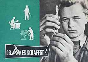 | |  | | | "Ob Du es schaffst?" (...Dir ein reiches Leben aufzubauen?") - "Dieses Heft bringt den Jungen im Schulentlassungsalter die Jugendschutzgesetze nahe und will Ihnen eine Lebenshilfe sein." (wohl 1953)