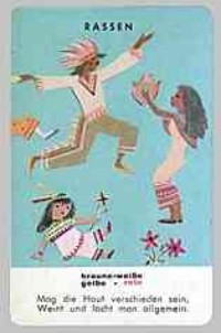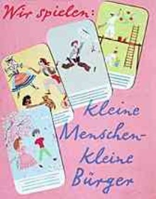 "Wir spielen: Kleine Menschen - Kleine Bürger" Quartettspiel, herausgegeben von der KONSUM-Genossenschaft. Auszüge aus dem Begleittext: Der Kuchen ist "für meine Schulfreundin, für Gisela. Ich glaube, sie hat schon seit einer Ewigkeit nicht mehr so schönen Kuchen gegessen. So etwas Feines gibt es bei Ihnen zu Haus nicht. - Ihre Eltern sind nämlich Flüchtlinge", fügte Lore erklärend hinzu, "und ihr Vater hat noch keine Arbeit gefunden. Deshalb müssen sie auch sehr sparsam sein." - "Flüchtlinge?" Walter war immer etwas altklug und tat, als wisse er über alles Bescheid. "Na ja, dann muß ihr Vater eben warten, bis alle anderen Arbeit haben, bevor er an die Reihe kommt." - Ist nicht wahr", widersprach Lore. "Mein Vati sagt, alle Leute haben das gleiche Recht auf Arbeit."  | |  | |  | Kleine Menschen - Kleine Bürger - "Rassen: braune - weiße - gelbe - rote" - "Mag die Haut verschieden sein, Weint und lacht man allgemein."