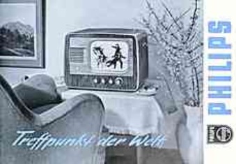 | Philips Fernseh-Tischgerät 1420 - "Treffpunkt der Welt - Jeder Tag soll Ihnen nach den kleinen und großen Sorgen Entspannung und Unterhaltung bringen. Wenn Sie jetzt abends nach Hause kommen, stellen Sie Ihren Fernsehempfänger ein und lassen die bunte Welt zu sich kommen." - Prospekt