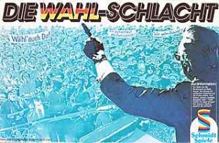 | | | | "Die Wahl-Schlacht" aus dem Jahr 1976, "Ein Spiel wie die Wirklichkeit im Wahlkampf. Sie können Ihr politisches Geschick auf die Probe stellen. Und bluffen, pokern, knobeln, täuschen oder - harte Fakten ins Spiel bringen. Der bessere Taktiker gewinnt die Schlacht." |