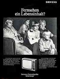 "2 bis 3 Stunden täglich verbringt der Bundesbürger vor dem Bildschirm. Am "Tatort", auf der "Drehscheibe", im "Sportstudio" oder im "Telekolleg". Denn Fernsehen ist eben nicht nur Unterhaltung, sondern auch Information und Weiterbildung. Um so wichtiger ist das Fernsehgerät geworden. Der störungsfreie Empfang und der zuverlässige Betrieb. Siemens-Farbfernsehgeräte werden deshalb auf Dauerbetrieb geprüft. Jedes einzelne Modul mit einem Computer. Das ganze Gerät 24 Stunden. Damit die Bildröhre - neuerdings 3 Jahre! Garantie - nicht beim nächsten "Derrick" ausfällt." - "Siemens-Fernsehgeräte leben lange" - Zeitschriftenwerbung