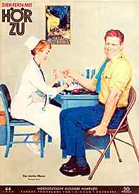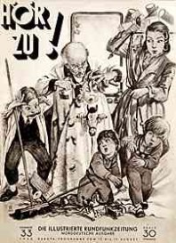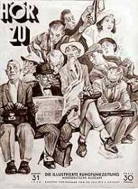Nach Kriegsende jedoch stehen sämtliche Medien erst einmal unter der Aufsicht der Alliierten. Insbesondere die westlichen Siegermächte messen dabei dem Rundfunk eine große Bedeutung zu, weil sie ihn für ein geeignetes Mittel halten, den Deutschen gezielt die Werte der Demokratie zu vermitteln und damit die „Reeducation“, die Umerziehung voranzutreiben. Entsprechend der dem Radio zugestandenen Wichtigkeit ist man daher großzügig bei der Vergabe von Lizenzen für Programmzeitschriften, deren Herausgabe nicht den Sendern selbst überlassen wird, sondern in die Verantwortlichkeit von nationalsozialistisch unvorbelasteten Verlegern übergeben wird. So erscheinen in der Folge rund zwei Dutzend einschlägige Publikationen, unter denen es der HÖR ZU! recht bald gelingt, die Marktführerschaft zu erlangen. Obwohl man sich durch Besonderheiten wie dem Abdruck farbiger Bühnenbilder zu im Radio übertragenen Opern und Operetten sowie einem gezielt optimistisch-lockeren Ton durchaus von der Konkurrenz abheben kann, ist dies jedoch nicht allein auf inhaltliche Qualitäten zurückzuführen, sondern hängt auch mit den unterschiedlichen Gegebenheiten in den verschiedenen Besatzungszonen zusammen. Denn während die Amerikaner in ihrem Zuständigkeitsbereich auf Dezentralisierung setzen und fünf unabhängig voneinander arbeitende Sender organisieren, vertrauen die Briten nach Vorbild der BBC auf die Einrichtung eines einzigen zentralen, öffentlich-rechtlichen Senders mit Sitz in Hamburg. Entsprechend erscheinen in der Amerikanischen Zone ebenso viele Programmzeitschriften wie es Radiostationen gibt, in der Britischen Zone ist HÖR ZU! jedoch erst einmal konkurrenzlos. Im Vorfeld hatte es der Verleger Axel Springer mit Erfolg verstanden, die verantwortlichen Stellen von seiner Eignung für diese lukrative Aufgabe zu überzeugen. Bereits unmittelbar nach Kriegsende hegt Springer in Gemeinschaft mit dem Verleger John Jahr und dem umtriebigen Boxer Max Schmeling erste Zeitungspläne, jedoch sollte es noch ein halbes Jahr dauern, bis er letztlich im Verlag seines Vaters Hinrich die ersten Projekte in Form von Unterhaltungsromanen und Kalendern verwirklichen kann. Derart gewonnene Erfahrungen und Kontakte helfen Springer sicherlich auch in den Verhandlungen mit den Briten weiter, die ihm schließlich die Lizenz erteilen, eine Programmzeitschrift für den Bereich des von ihnen kontrollierten Nordwestdeutschen Rundfunks (NWDR) herauszugeben. Nach einem ersten, weniger zufrieden stellenden Versuch mit einer Publikation namens „Radio-Woche“ trifft Springer auf das publizistische Multitalent Eduard Rhein, der in der Folge maßgeblich an Konzeption und Gestaltung der Ur- HÖR ZU! beteiligt ist und darüber hinaus während der folgenden knapp 20 Jahre für deren Erscheinungsbild tonangebend verantwortlich zeichnen soll. Das Startheft erscheint trotz allgemeiner Papierknappheit in der ungewöhnlich hohen Auflage von 250000 Exemplaren, was zum einen auf die guten Kontakte Rheins zurückzuführen ist, zum anderen auf die allgemeine Angst vor dem beginnenden „Kalten Krieg“ mit dem Ostblock. Um der Propaganda des ostzonalen „Berliner Rundfunks“ etwas entgegen zu setzten, hält es beispielsweise der Leiter des Berliner NWDR für „nahezu lebensnotwendig, das Programm des Senders unter der Berliner Bevölkerung so schnell wie möglich und so umfangreich wie möglich bekannt zu geben.“ So präsentiert alsbald zum Branchenüblichen Verkaufspreis von 30 Pfennig die „HÖR ZU! Nummer 1“ in farbigem Umschlag das Radioprogramm vom 15. bis 21. Dezember 1946, in einem „An unsere Leser“ überschriebenen Geleitwort erinnert die Redaktion an die Vergangenheit und formuliert ihren Anspruch für die Gegenwart: Kriegsbedingt „mussten schon im Mai 1941 alle Programmzeitschriften ihr Erscheinen einstellen. Nun will HÖR ZU! das alte Band zwischen Rundfunk und Hörer aufs Neue knüpfen, ohne den alten Faden weiterzuspinnen. HÖR ZU! will nicht eine Illustrierte ersetzen, nicht eine Gartenlaube mit Häkelmuster und Rundfunkprogramm sein, nicht mit der Bühne und dem Film kokettieren. HÖR ZU! will zur reinen Urform der Rundfunkzeitung zurückführen…“. Der Blick nach vorn verheißt vorsichtigen Optimismus: „HÖR ZU! hält den Rundfunk nur für eine Vorstufe des farbigen, plastischen Fernsehrundfunks. Seine Entwicklung ist bei uns vorläufig unterbrochen…Sie trotz all unserer erdrückenden Alltagssorgen nie aus dem Auge zu verlieren, halten wir für eine Verpflichtung gegenüber der Zukunft.“