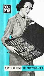 | |  | |  | Württembergische Metallwarenfabrik "WMF" - "von morgens bis Mitternacht" | | Alsterhaus - "Das geht alle Frauen an - hoch die Gläser - hoch die Tassen - weil die Preise nachgelassen", großformatiger plakativer Prospekt (um 1954)