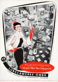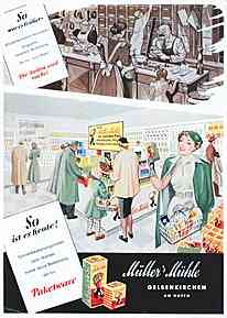 | | | |  | Müller's Mühle - "So war es früher - pfündchenweise abwiegen, langsame, veraltete Bedienung, da nur "lose Ware". Die Zeiten sind vorbei" - "So ist es heute! Schnellbedienungsladen, kein Warten, keine teure Bedienung, da nur Paketware" | | | | Lubecawerke GmbH - "Die Blechpackung - das gute Kleid Ihrer Erzeugnisse" - Mehr zum Thema Verpackung / Produktdesign der 1950er Jahre HIER |