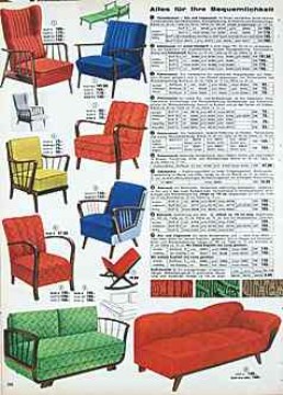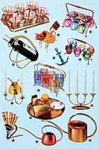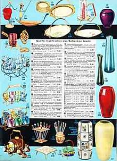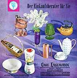 | Zeitgenössischer "Schnickschnack" in einem Versandhauskatalog, z.B.: "Eloxierter Salzletten- und Brezelständer", "Patina Anker-Korkenzieher mit Tau", "Rauch-Service in Messing-Kupfer-Ausführung"