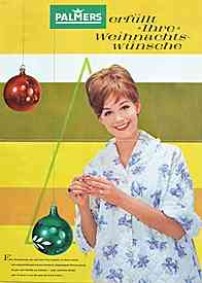 | | PALMERS "erfüllt Weihnachtswünsche", Prospekt - Titelfoto: "Ein Wunschtraum, der wohl jede Frau beglückt, ist dieser weiche, sehr elegante Morgenrock aus wattiertem, abgestepptem Perlonmaterial." |