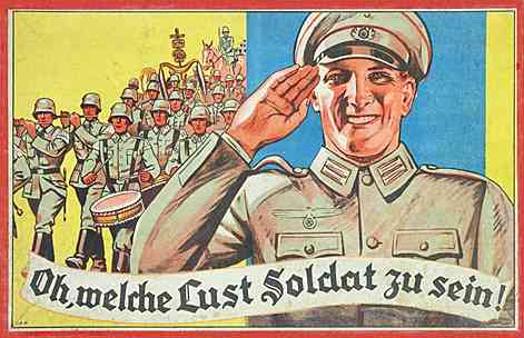 | "Wer will unter die Soldaten? Der muß haben ein Gewehr und auch sonst so manches mehr! Wenn man gar erst General ist, braucht man Truppen, Tanks und Kriegsgerät." (1938)