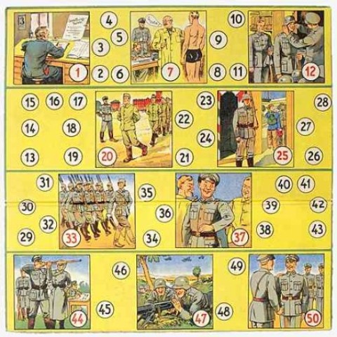 | "Oh, welche Lust Soldat zu sein", Brettspiel um 1935 - "Dieses lustige Gesellschaftsspiel zeigt euch das Leben und Treiben der Soldaten in Kaserne und Manöver"