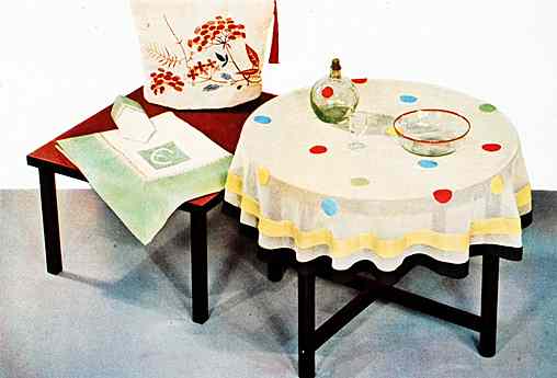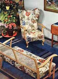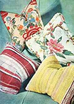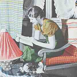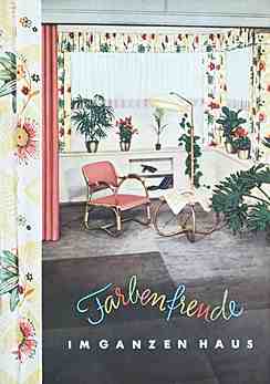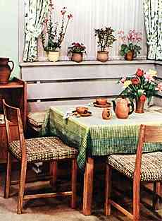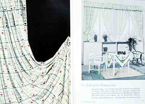 "Die Wohnlichkeit dieser Sitzecke ist durch eine harmonische Farbabstimmung der Möbelbezüge, Vorhangstoffe, Kissen und Tischdecken erzielt."