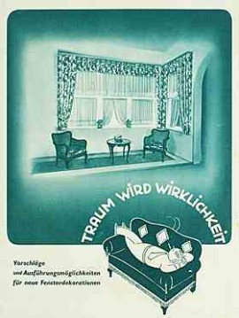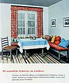 "Trauliche Wohnecke mit indanthrenfarbigen Stoffen freundlich ausgestattet" (1938)